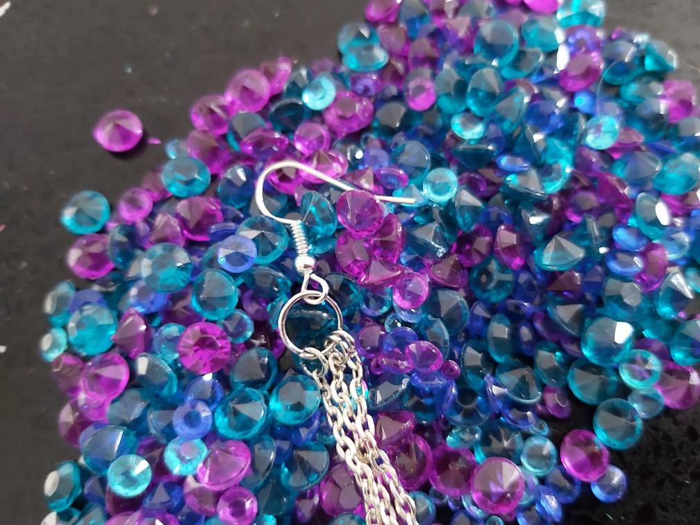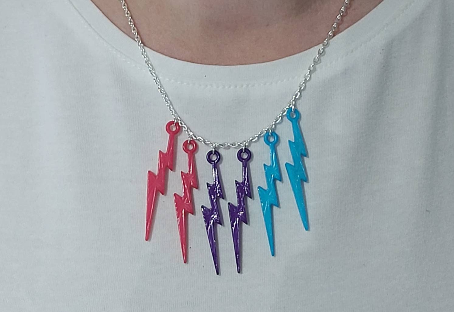 Triple drop Lightning bolt earrings. Pink, purple and blue . Plastic lighting bolts on silver plated chains with silver plated hooks.